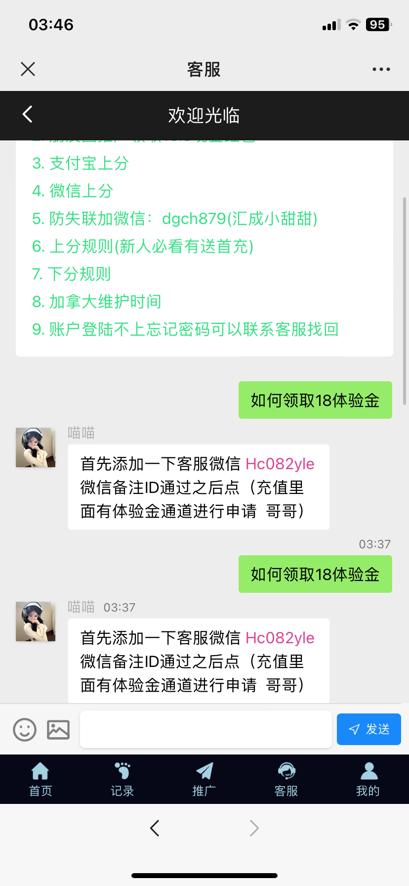 添加微信客服发ID后到充值体验金通道提交18