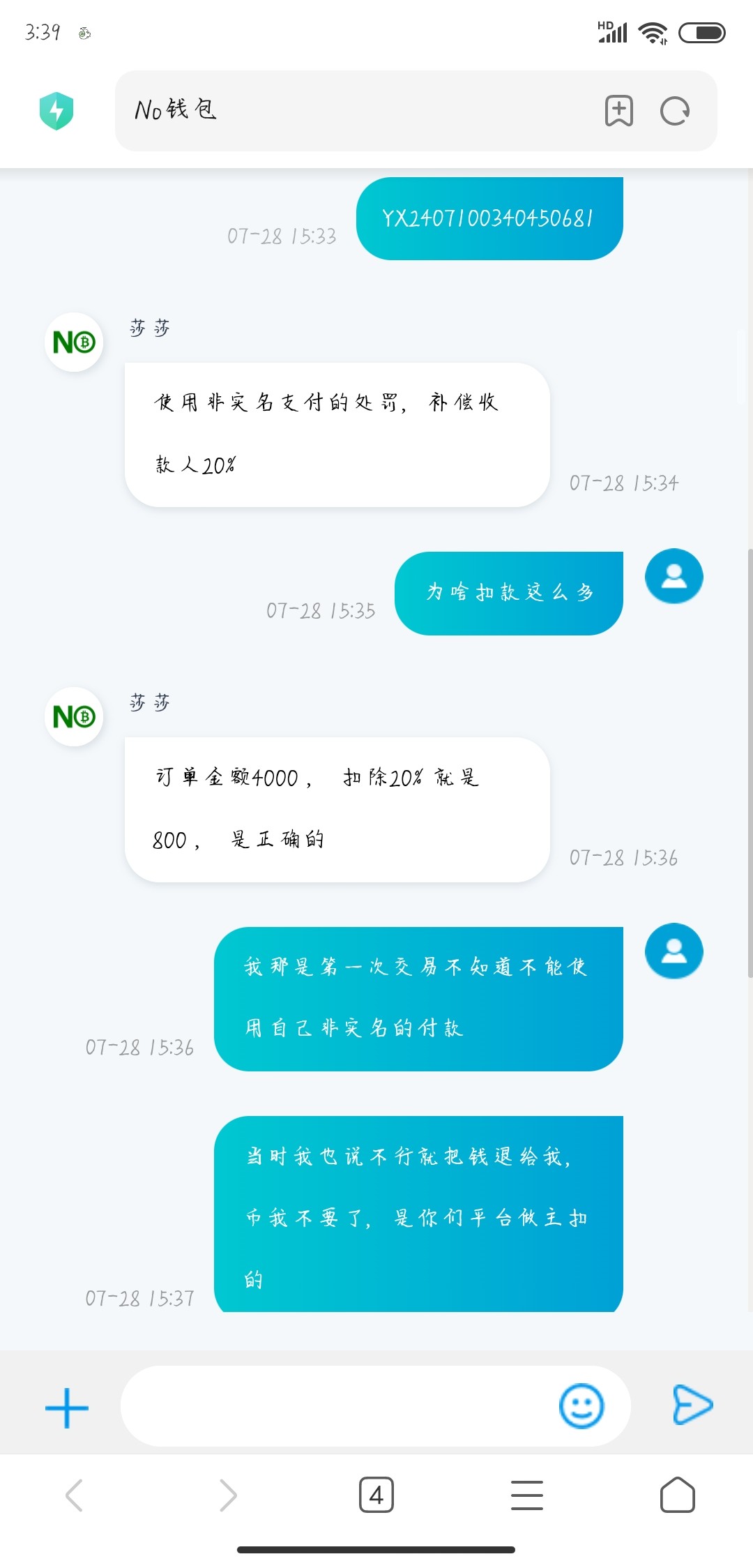 几百块我都慢慢出,大额就找收币的,我有一个固定的收币老板,大额或者急用就找收币的,平台挂单出售,他购买,微信转账,我出币,这不比你那个强,被扣八百
