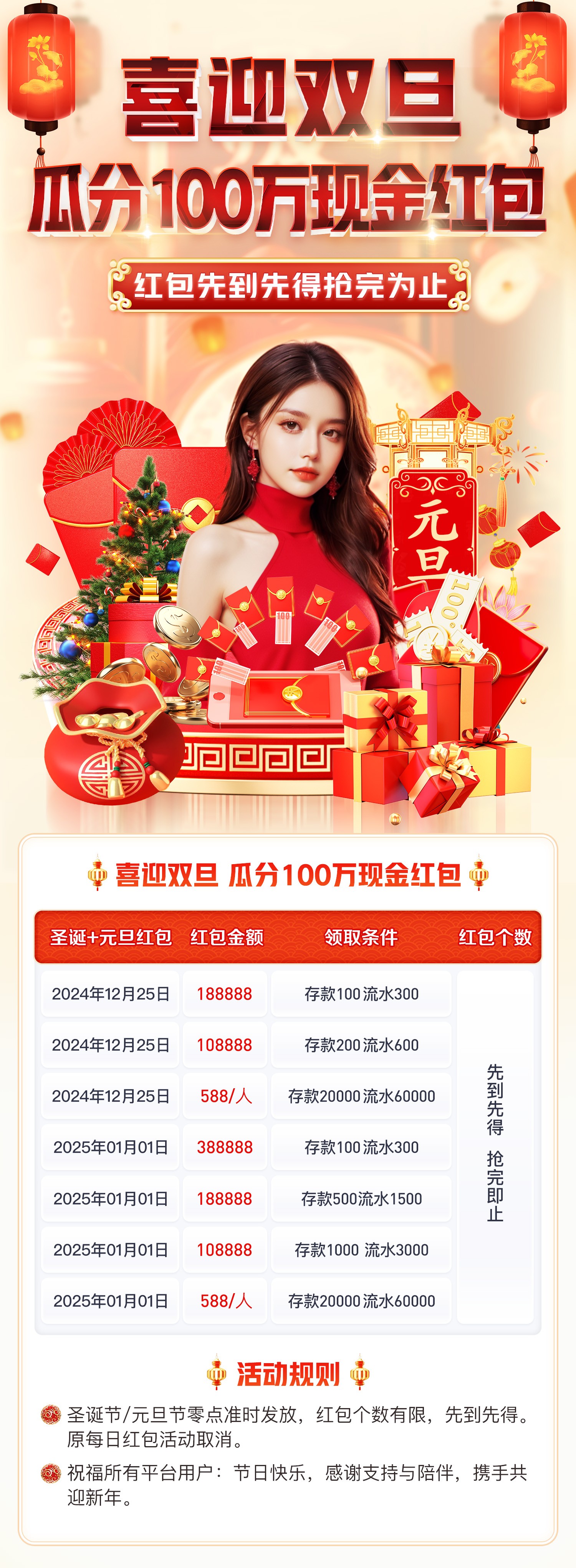 元旦节日(01月01日)0点开始瓜分 388888+188888+108888 现金红包,最高可领取588/人;