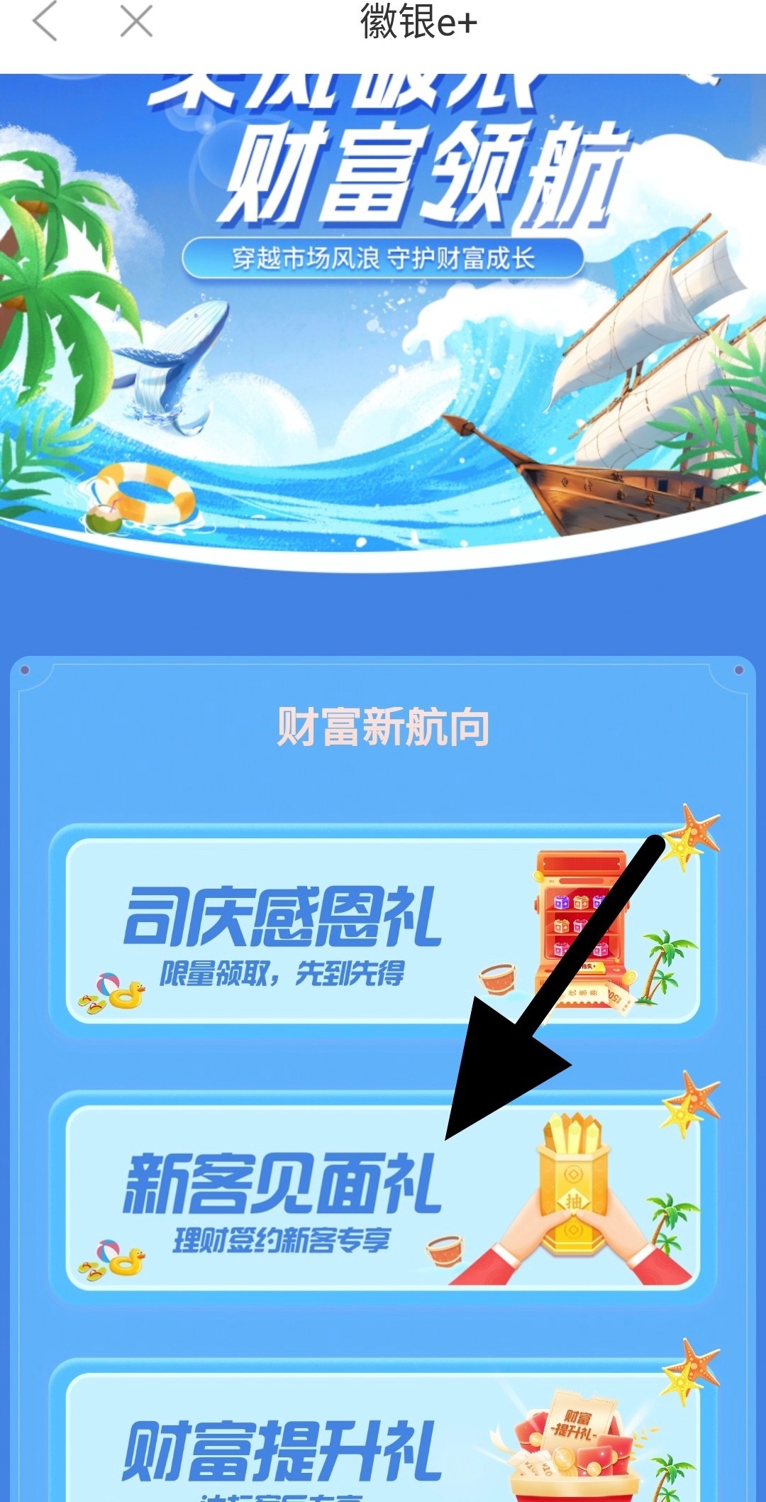 打开app首页全部,找到那一栏便民生活,微享生活,乘风破浪财富领航,新客见面礼,可能刚开始显示不支持,回到首首页搜索理财一键签约在回去就能领了